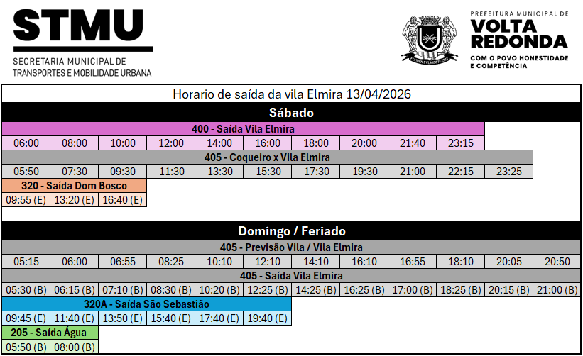 A Secretaria Municipal de Transporte e Mobilidade Urbana (STMU) informa os horários de operação das linhas com atendimento à Vila Elmira, válidos para sábados, domingos e feriados, referentes ao mês de abril de 2026.